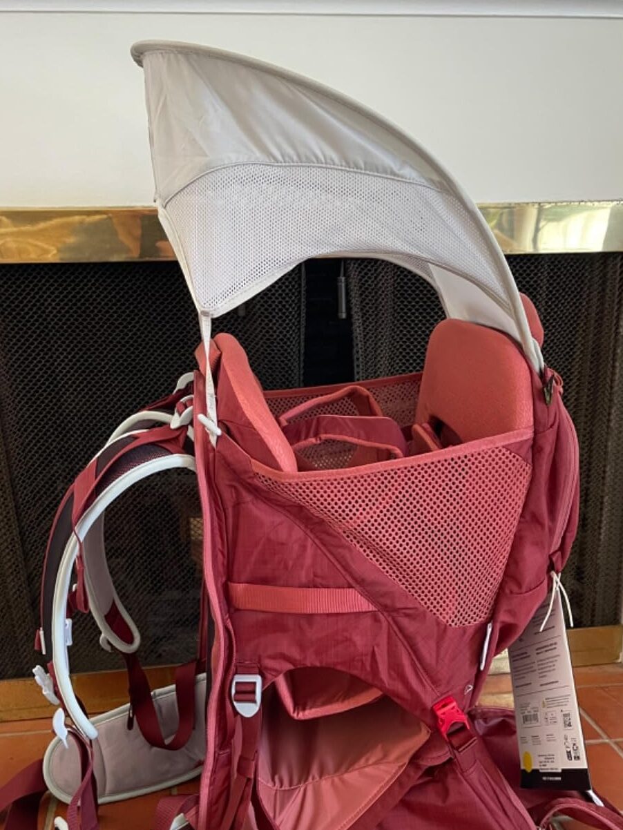Please do not use your typical carrier when taking your child hiking. I highly recommend investing in a sturdy carrier with a steel frame and a 5-point harness that is designed for hiking. This will help keep your baby safe in the event that you fall. Additionally, they offer additional comfort for your child by providing a supportive seat. As well as additional comfort for you with a padded adjustable hip belt and shoulder straps. These features help to distribute the weight you’re carrying evenly. The carrier that I recommend also offers ample storage, a built-in sunshade for your child, and mesh paneling to keep your little one from sweating. For a simple day hiking trip, I recommend the Osprey Poco Light.