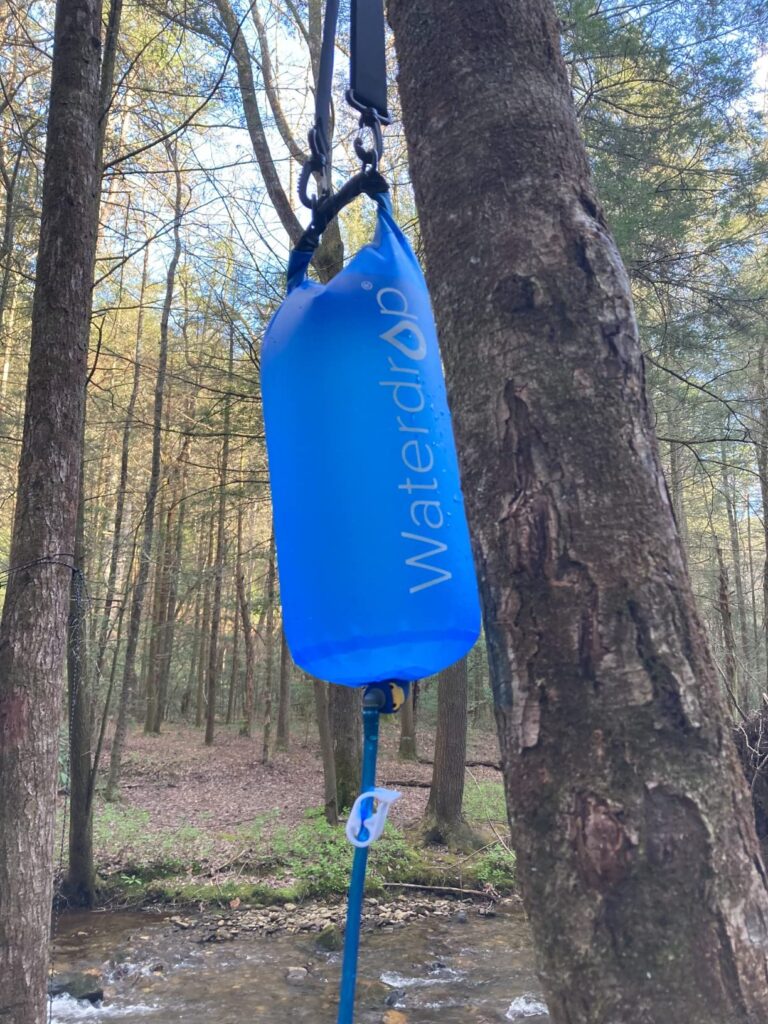 This water purification system is portable and allows you to purify water from any source. This is important because you do not want to run out of water, and you also do not want to run out of clean water. The bag holds 1.5 gallons of water and can be easily hung from your pack or from a tree at your site.